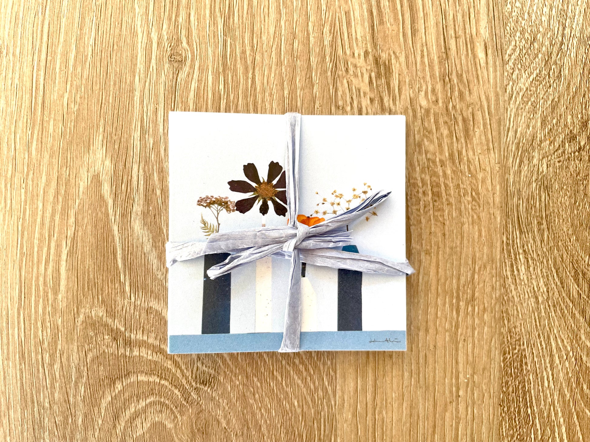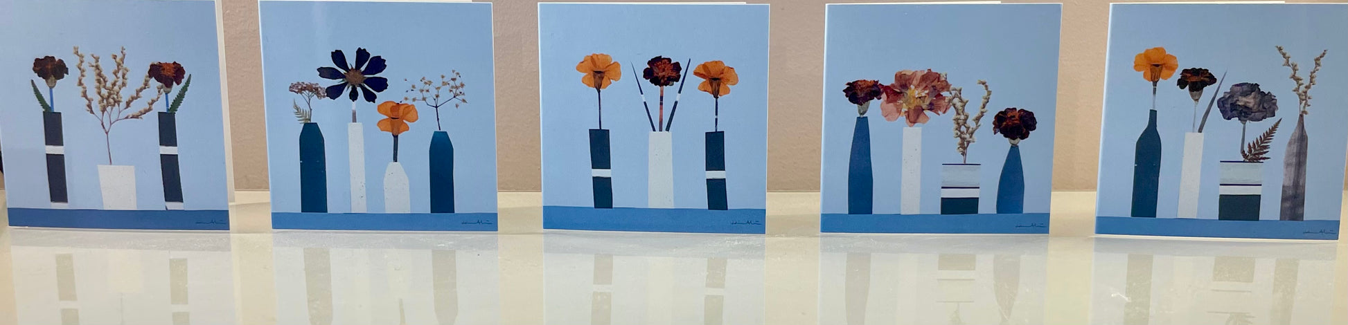 Skärgårdskollektion 5 kort med 5 olika motiv storlek 7,5 x 7,5 cm. Korten upptryckta från handgjorda original som gjorts i collageform med pressade blommor och papper. Korten är inspirerade av Stockholms skärgård.